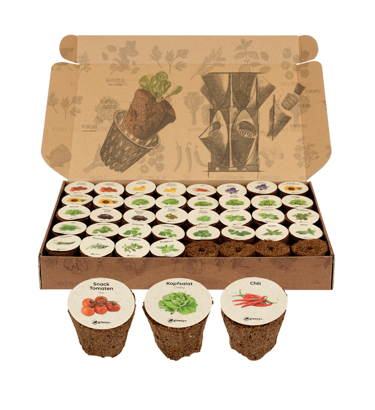 Mit dem Premium Pflanzen-Set erhältst du eine sorgfältig zusammengestellte Auswahl aus 40 Pflanzenkapseln, bestehend aus 25 verschiedenen Sorten. Ob aromatische Kräuter, knackige Salate, bunte Blumen oder fruchtiges Gemüse wie Tomaten und Chilis – dieser Mix bietet alles, was du für deinen grünen Start brauchst.