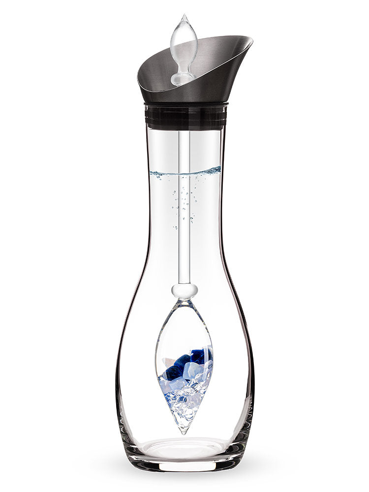 In einem patentierten Verfahren gefertigt, scheint der Edelsteinstab in der Karaffe zu schweben. Durch gezielte Wasserharmonisierung entsteht ein ruhiges, klar strukturiertes Edelsteinwasser – für Momente des Ankommens.