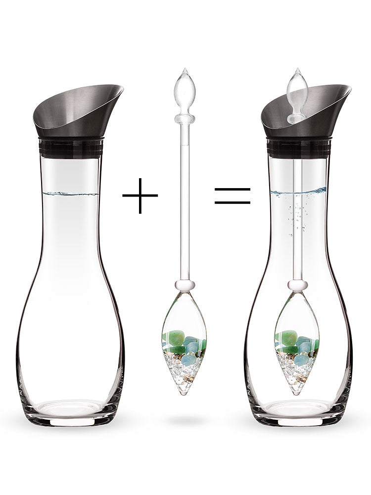 Dieses exklusive Set aus einem handgefertigten Edelsteinstab und einer eleganten Glaskaraffe bringt Frische und Balance in dein Leben. Der Edelsteinstab wird in einem patentierten Verfahren mundgeblasen und scheint nahezu schwerelos in der Karaffe zu schweben.