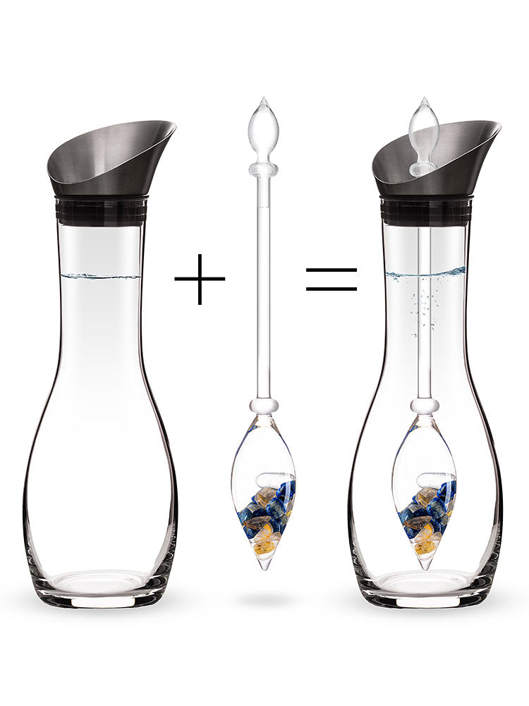 Dieses exklusive Set aus einem mundgeblasenen Edelsteinstab und einer eleganten Glaskaraffe lädt dazu ein, dein Wasser auf besondere Weise zu veredeln.