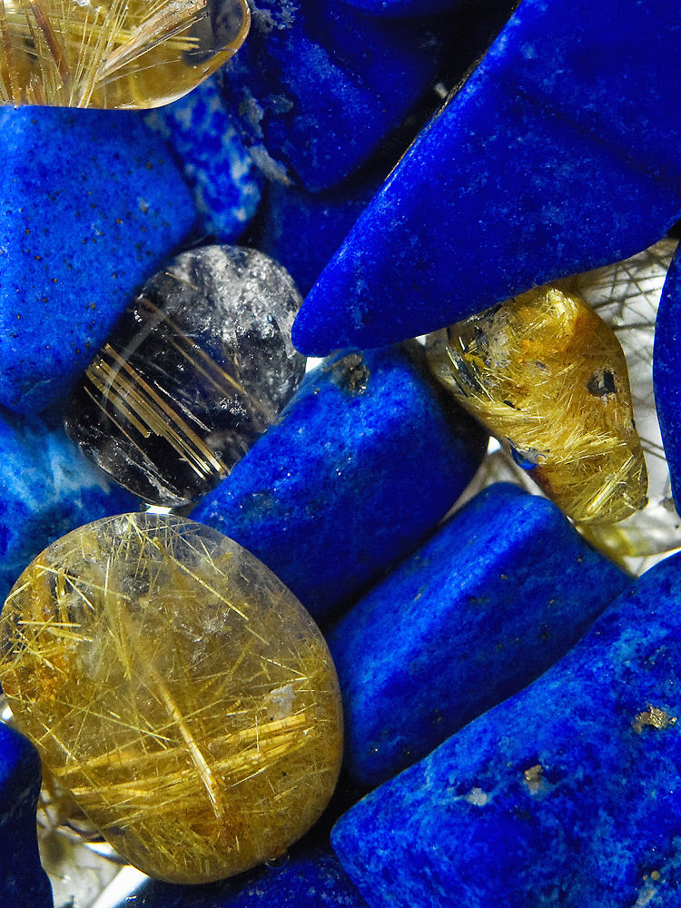 Lapislazuli – Rutilquarz: Diese Edelsteinmischung weckt neue Perspektiven. Der tiefblaue Lapislazuli steht für Wahrheit, geistige Freiheit und Ausdruckskraft, während der strahlende Rutilquarz mit seiner goldenen Energie Visionen beflügelt.
