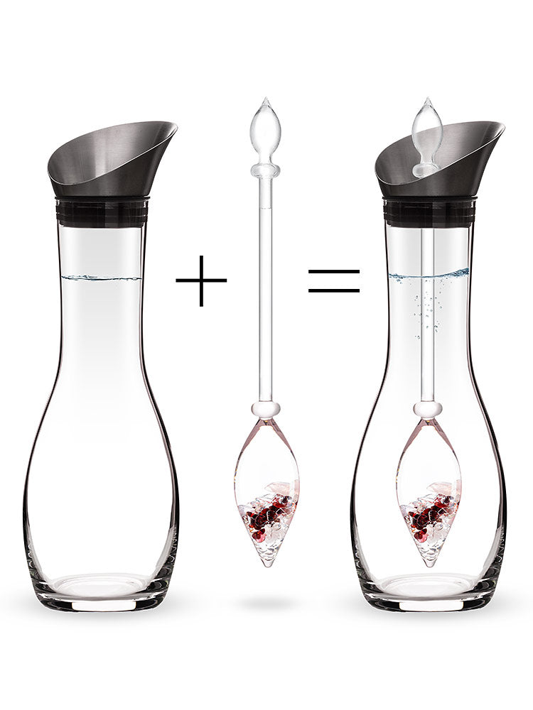 Jeder Edelsteinstab wird in einem aufwendigen, patentierten Verfahren mundgeblasen. In der außergewöhnlichen Karaffe scheint er schwerelos zu schweben und verleiht deinem Trinkwasser eine neue Dimension der Qualität und Ausstrahlung.
