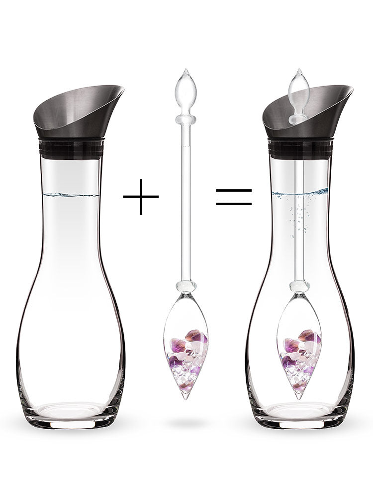 Dieses exklusive Set vereint einen mundgeblasenen Edelsteinstab mit einer formschönen Glaskaraffe – die perfekte Kombination, um dein Wasser auf natürliche Weise zu veredeln.
